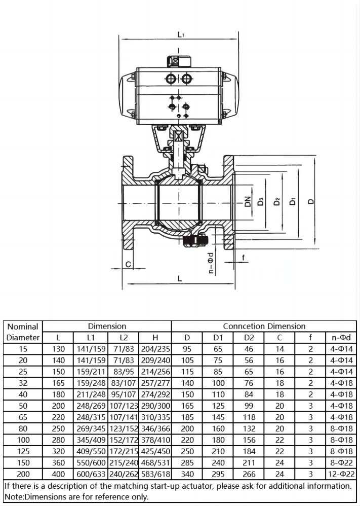 - Specification:Port size:DN15~DN100Ball Valve Material: 304 Stainless SteelStructure Form: Two WayBall valve type: 3 pieces type valve body.Ball valve connection: Flange TypeValve seat: PTFEFluid: Water, hot water, air, hot airFunction: water treatmentTop connection standard: Double actingActuator pressure: 0.15~1.6MPaQuantity: 1 set(1 actuator + 1 ball valve)Environment temperature:-15-150℃/-10-280℃