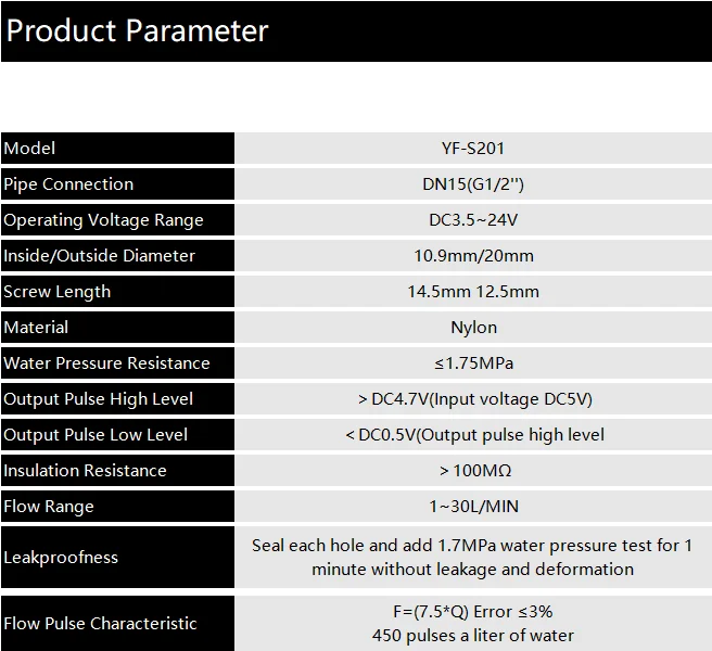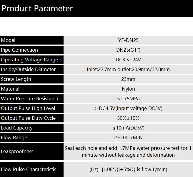 - Specification:External threads: 1/2", 3/4", 1", 1-1/4", 1-1/2", 2"Temperature: -25~+80℃Allowing pressure: 1.75MpaLoad capacity: 10 mA (DC5V)Working voltage range: DC3.5~24VCurrent:≤10MAMaximum operating current: 15 mA (DC 5V)Flow Ranges: 1/2inch:1-30L/min,3/4inch: 2-60L/min,1inch: 2-100L/min,1-1/4inch: 1-120L/min,1-1/2inch: 5-150L/min,2inch: 10-200L/min